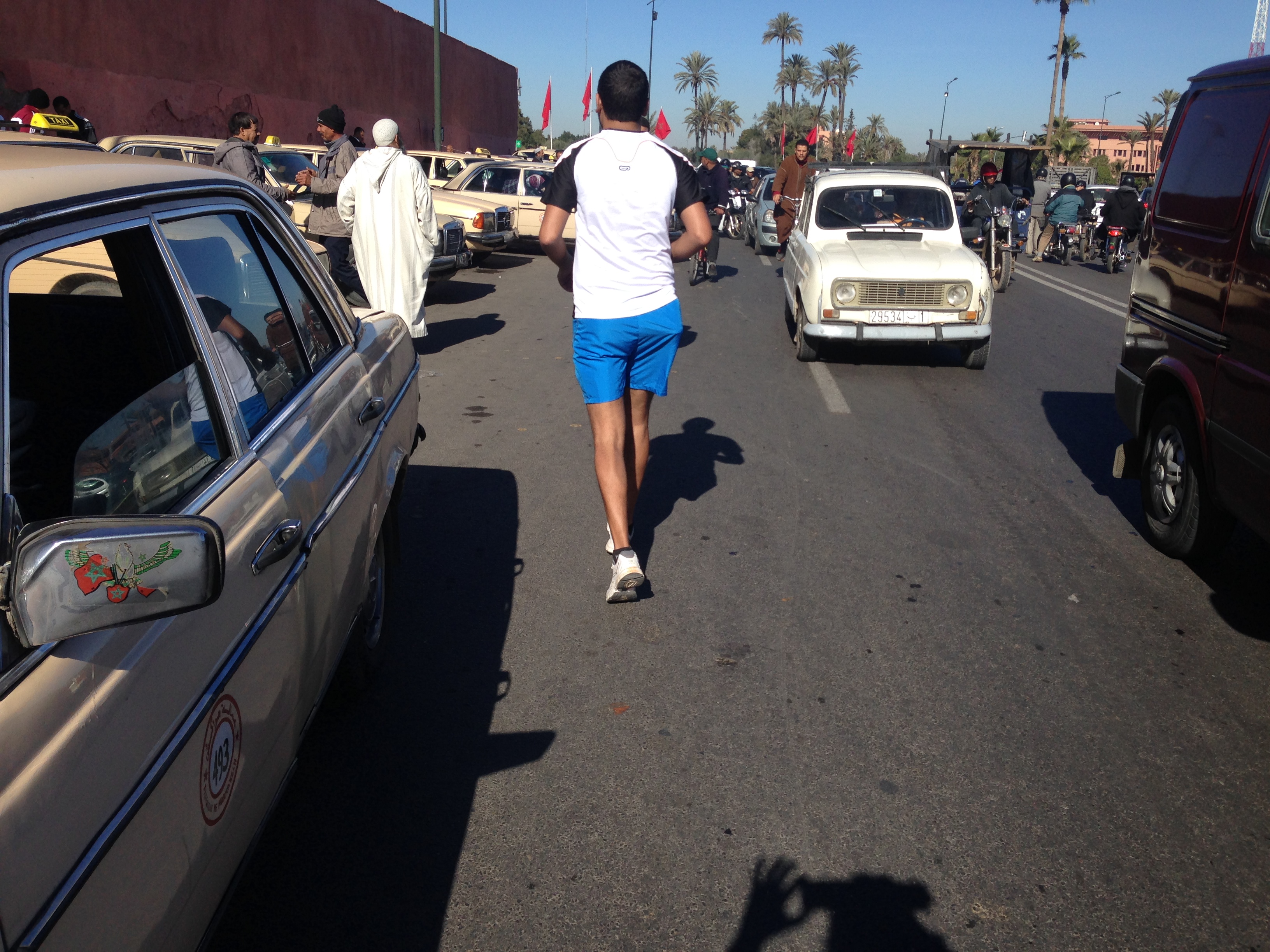 The route looped us through the city, with views of the mountains in the distance and some pretty passages through gardens and palm-flanked streets. It all got a bit crazy round Bab Doukalla, jostling for position with taxis, donkeys, scooters, and bikes. The last few kms, my legs felt really heavy and my eyes were streaming from the car fumes. I didn’t realise quite how spoiled I had become with the pure air of The Peak – time to toughen up! The good thing about suffering at the moment though is I just think, “Great, remember it is going to be a million times worse on MdS.